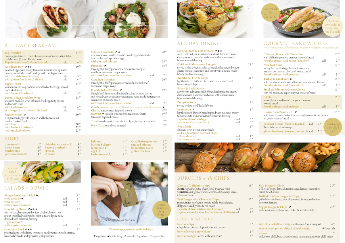 - Salads and Bowls: Options such as the Shingle Inn Caesar Salad, Nourishing Bowl, and Goodness Bowl provide lighter, health-focused choices.