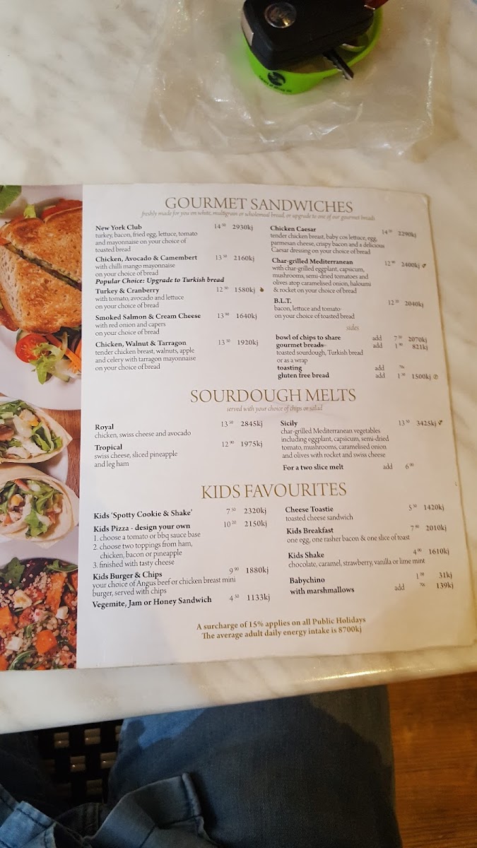 - Kids Favourites: Designed for younger patrons, this category features items including Kids 'Spotty Cookie & Shake,' Kids Pizza (Design Your Own), Kids Burger & Chips, Vegemite, Jam or Honey Sandwich, Cheese Toastie, Babychino with Marshmallows, Kids Breakfast, and Kids Shake.